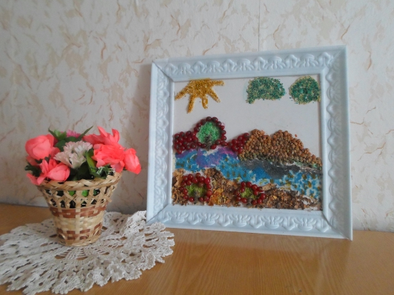 Цель: изготовление панно с использованием природного материала и круп. Задачи: - воспитывать аккуратность при работе с крупами, бережное отношение к природе и её дарам; - развивать мелкую моторику, творческое воображение, художественный вкус; - учить комбинировать разные виды круп, листвы и др. природных материалов. Материалы:крупы (манная, рисовая, пшено, чечевица, сухие листья, плоды калины, гуашь и клей ПВА, пластиковая основа, рамка. | |